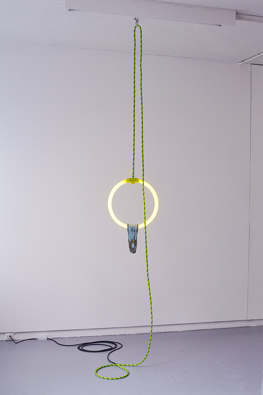 Circular fluorescent light, sailing sheet, copper glazed ceramic form (2015)